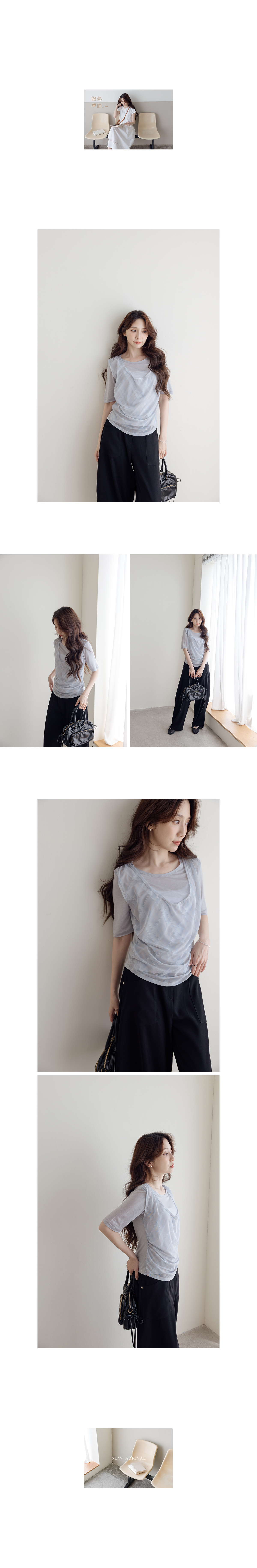 正韓 假兩件透光格紋垂領棉T
