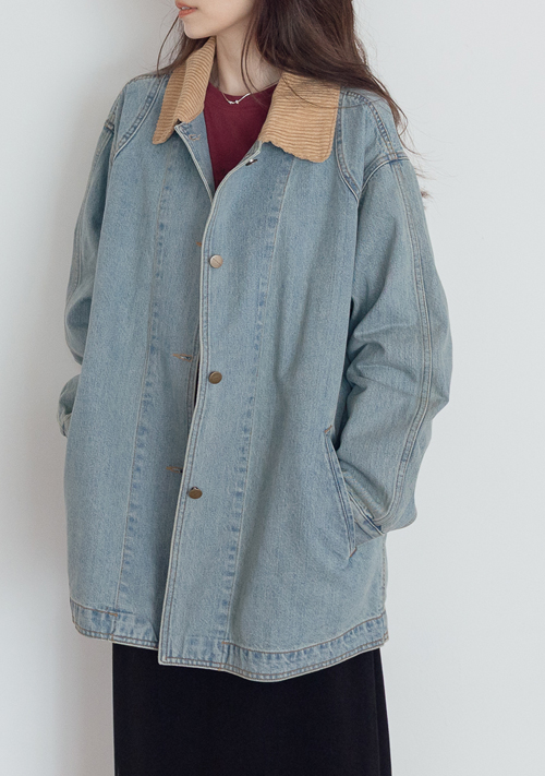 正韓 (限量特價)高質感坑條領長版牛仔外套