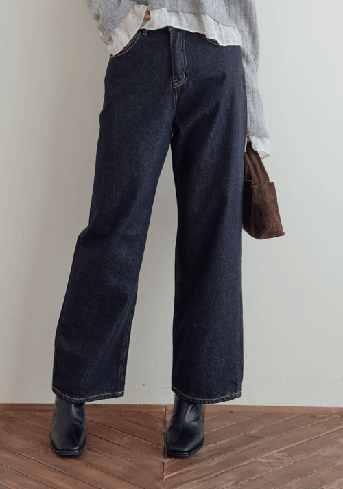 正韓 不掉色深藍內刷棉直筒褲