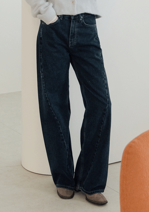 正韓 深藍瘦瘦斜拼接牛仔褲