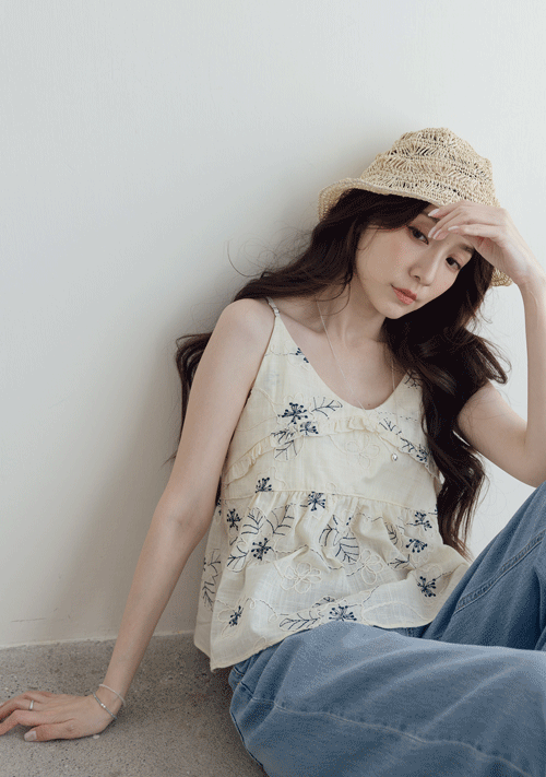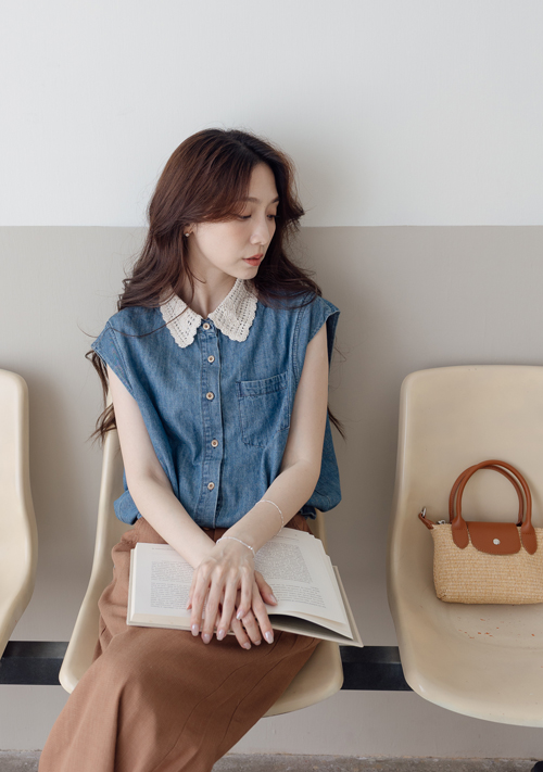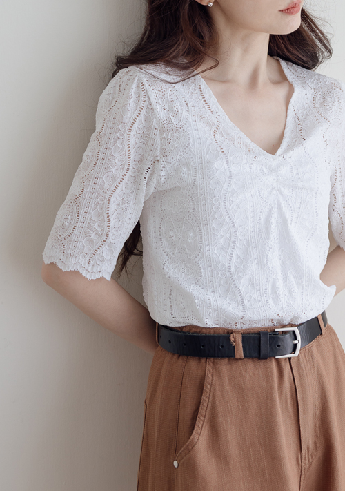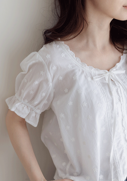 正韓 甜美U領布蕾絲小花刺繡棉衫