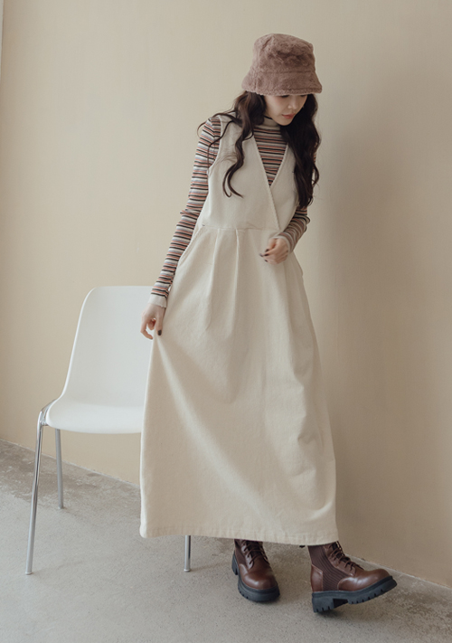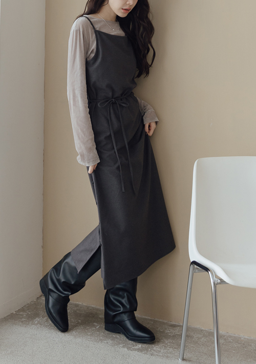 正韓 深灰側排釦細肩帶羊毛洋裝