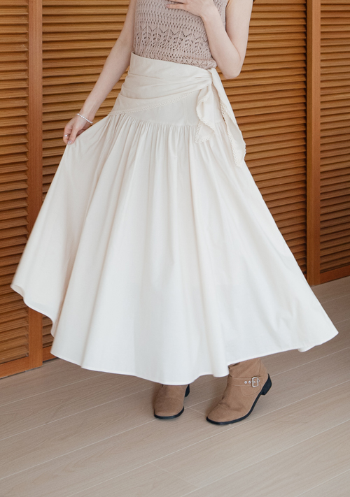 正韓 米杏色圓裙+三角滾邊蕾絲巾