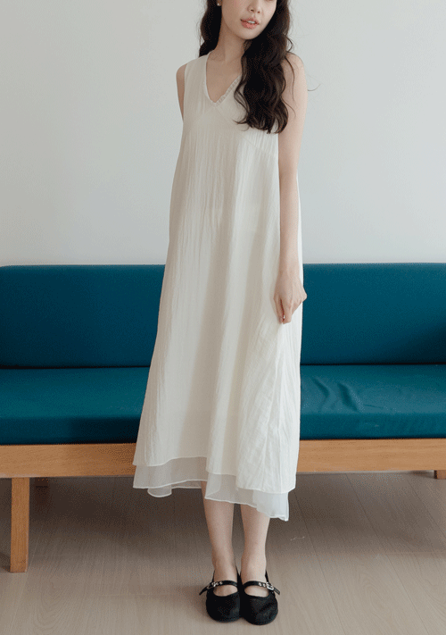 正韓 小V領荷葉雪紡紗接邊長洋裝